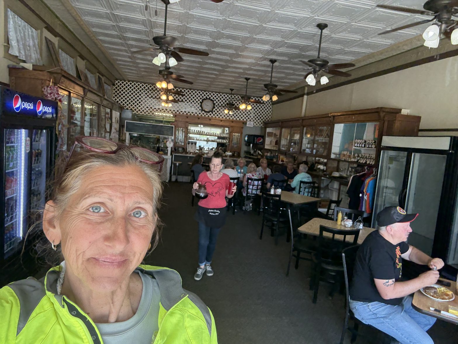 Stopped in Potter, NE which is home to the famous Tin Roof Sundae and Duck Pin Bowling. The Potter Sundry had a high ceiling and the wood cabinets with decorative brass pulls were from the previous tenant, a pharmacist.