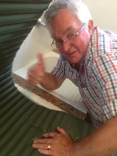 My Irish neighbor at the campsite, Dennis, decided to pitch in and help me with my ornery air mattress project. He and his wife, Kay, are traveling by camper and he has all the “niggley” stuff I just can’t carry.