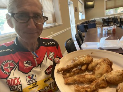Carolyn watched me eat the somewhat greasy frog’s legs, dipping them in ranch dressing. “Doesn’t look like you’ll need that to-go box,” she said.