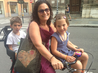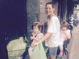Men and women with baby seats on their bikes, running errands with children in tow. Such an easy way to get around town!