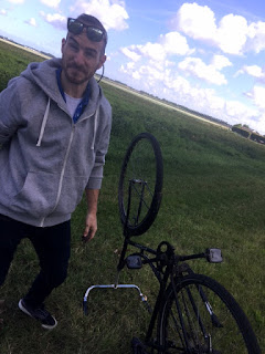 Stopped to help Fernando at the side of the road; his chain slipped off. The unique thing about a cycle in Holland is that they all seem to have wrap-around chain guards. Good at keeping grease off a pant leg but a total hindrance with small screws if you need to fix. We teamed up and solved it.