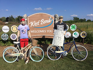 She was welcomed home tonight as she approached the West Bend welcome sign on the corner of Valley Avenue and West Washington Street (Hwy. 33) by Hank and Essie, Barton’s beloved mannequin sweethearts, as well as others who braved the heat. Then it was on to a good, old brewski to refill the tank.