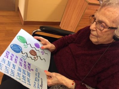 One of the great surprises on her birthday was a special visit by the Behlke family from Jackson. Bernice, Sarah, David and Ron brought vanilla cupcakes and sang several hymns as a gift to Lucille.