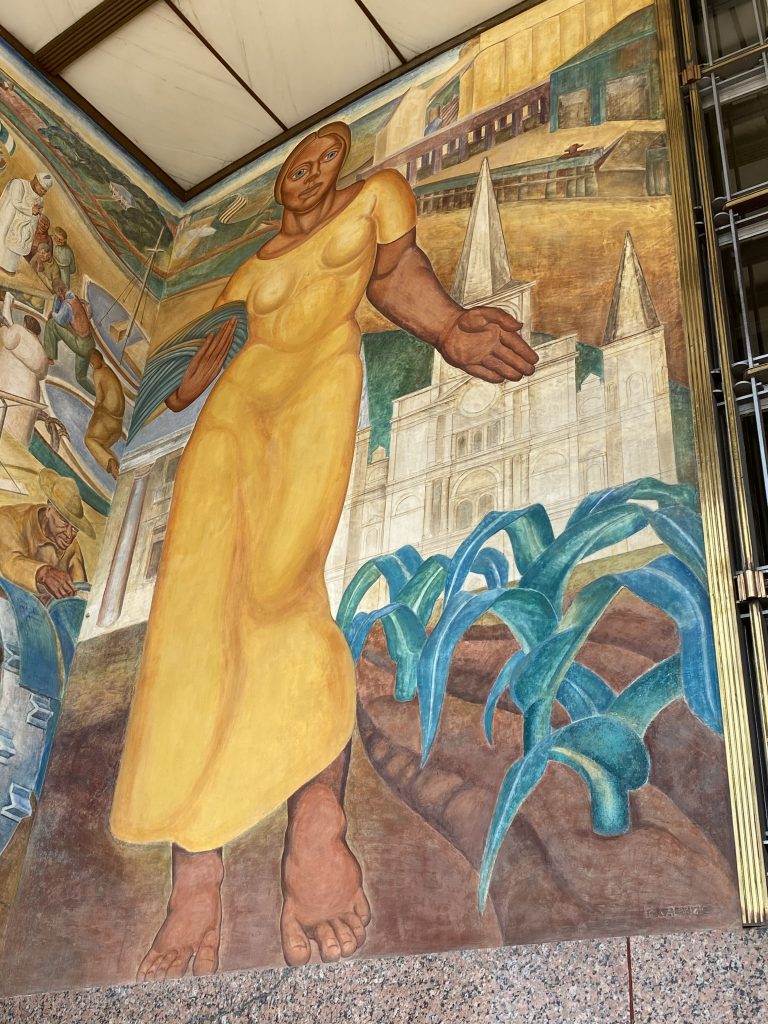 The four-panel fresco at the entry was composed by Conrad Albrizio and it represented south and north Louisiana and the respective industries during the late 1930s.