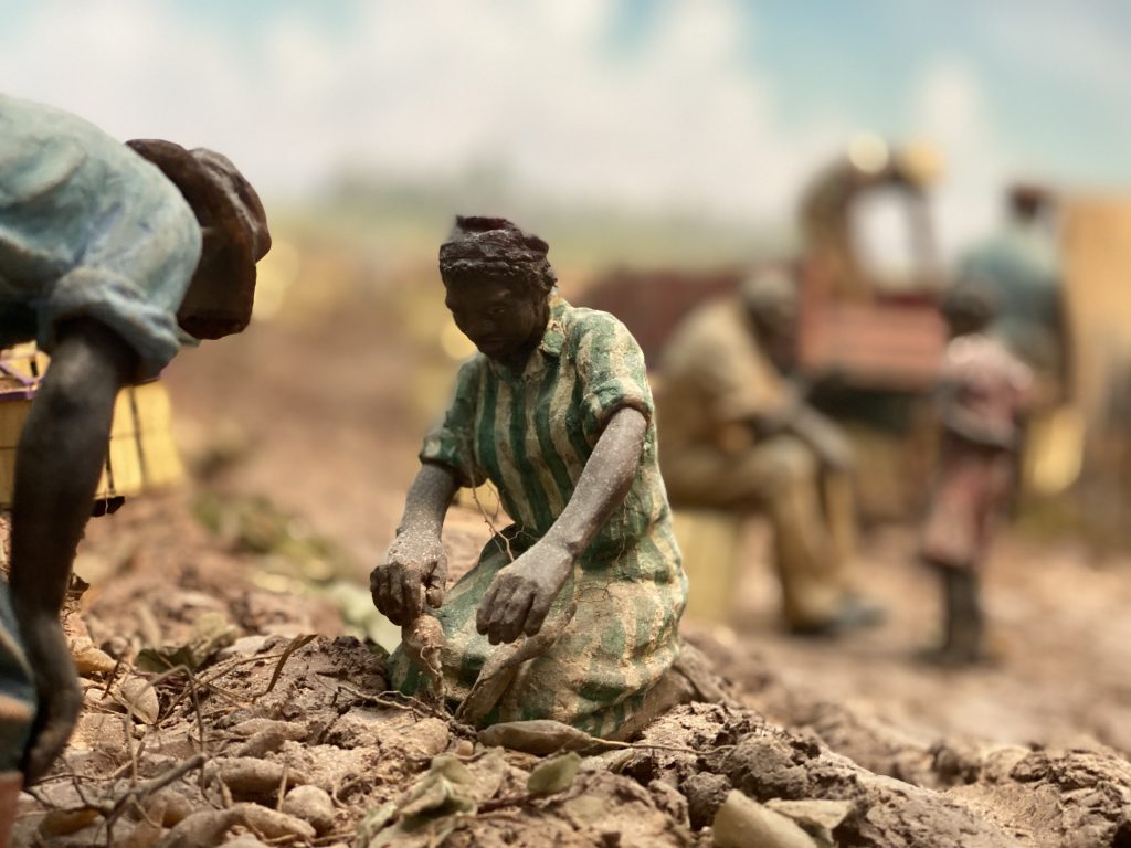 Each figure has a unique face; the women are wearing lipstick and the men straw hats. There are frowns on the faces from fatigue and working in the sun.