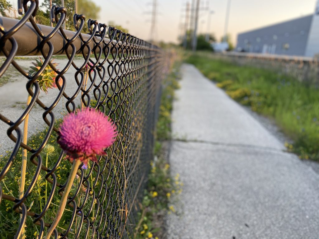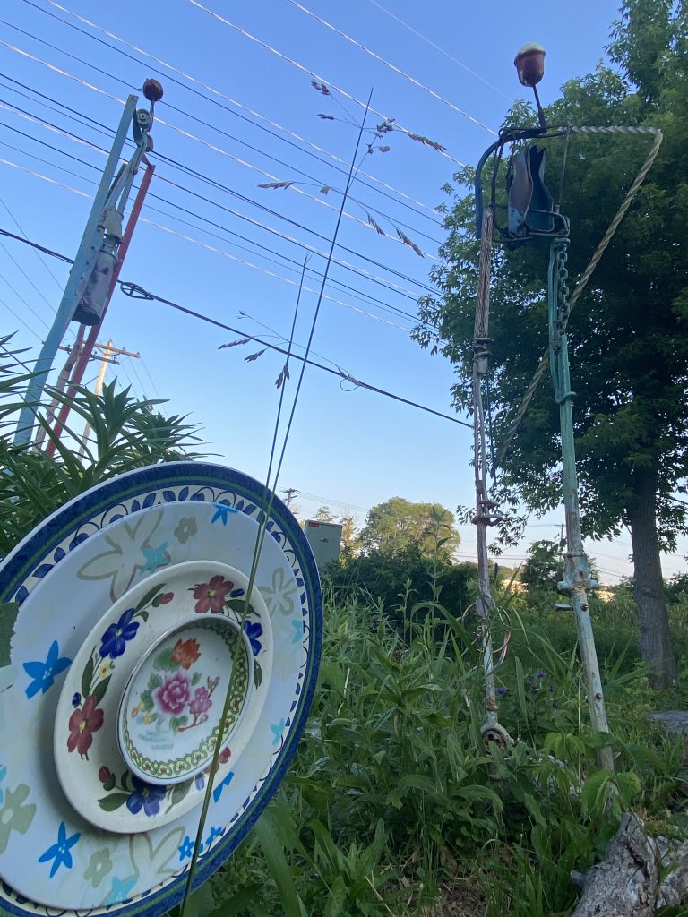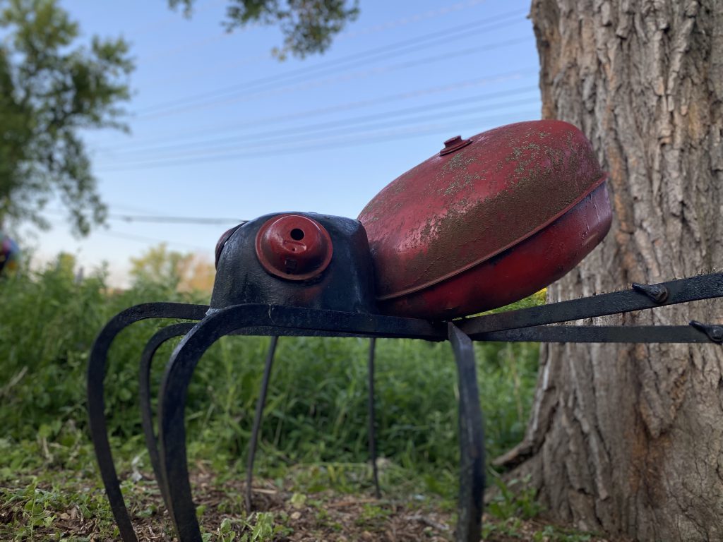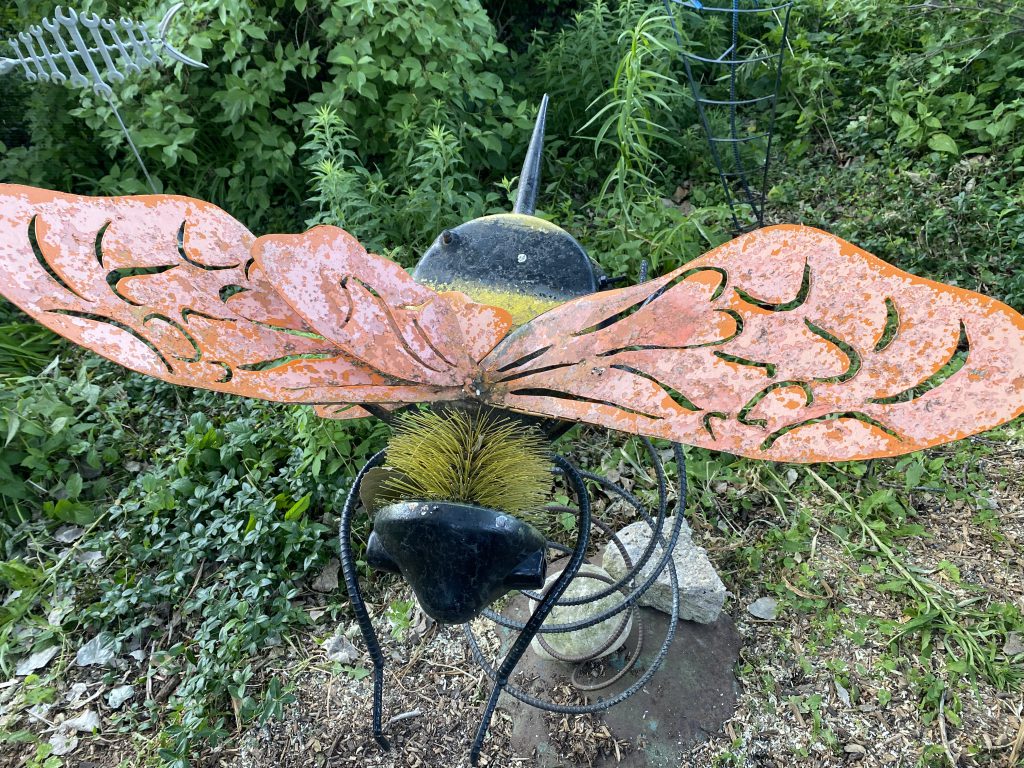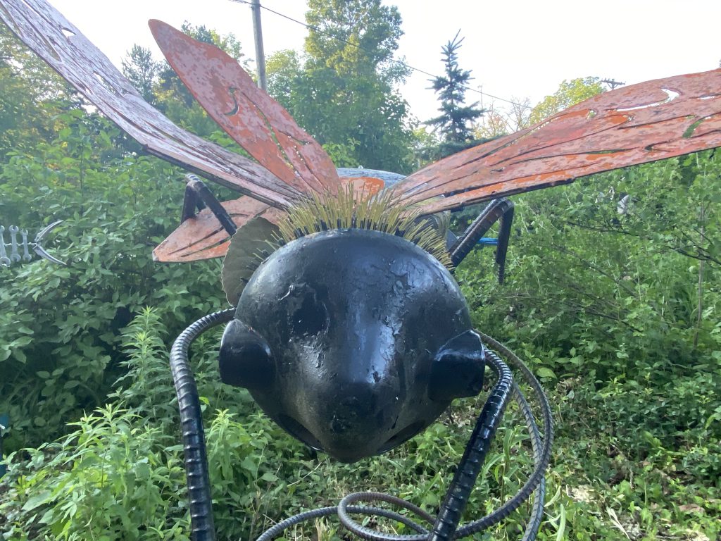 There’s a bumblebee made of a black and yellow painted cast iron pan with a pointed handle. The head is cleverly made out of industrial bristles from a monster circular brush.