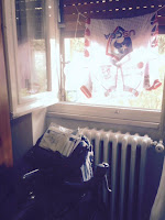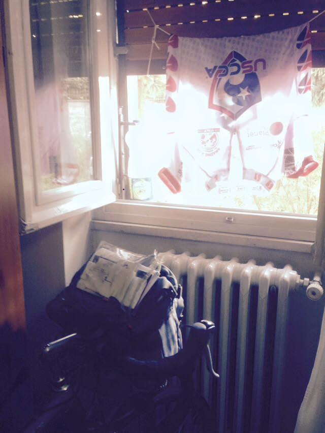 -That’s my stinky jersey hanging from my shoelace laundry line in the one window in my room at Hotel Rosy.