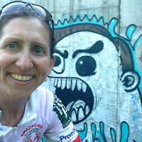 (L) A bit of street art from Italy. It was on the walls as I came out of a tunnel on a bike path in Milan. Lots of blind turns on the path and other bicyclists whistling a warning or giving a courtesy ring on their bell. I feel at home; so many people from my tribe. The streets are full of bikers of all ages. Amazing how fit the senior citizens are!