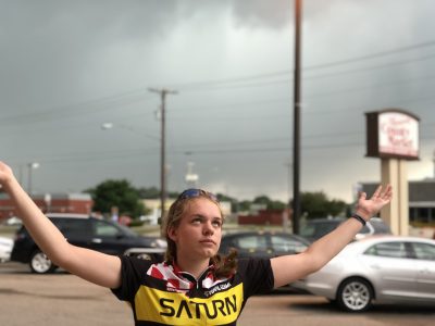 – This is me stretching during a break. This was right before I threw back a couple of Advil. Audrey is keeping a relaxed pace of about 14-17 mph. I’m fighting to keep up.