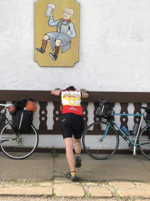 – We have a tortoise-and-hare style of biking on this tour. Audrey attacks the hills and powers up them while I pace myself. Audrey takes a nice long flat road, purposely falls behind and then races past me giggling, “I’m in my biggest gear.” Or she will spin by me with legs a-blur. “I’m in my smallest gear…” I don’t even ask anymore; there’s usually a tie to speed skating and training. By about mile 40 those antics stop and the question of “how many more miles left…” becomes quite frequent.