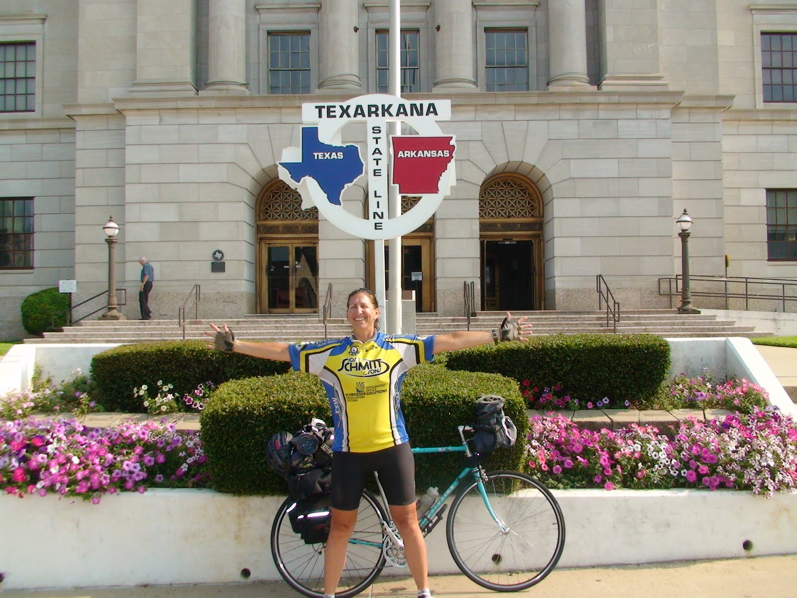 Crossing the state line from Texas into Arkansas in Texarkana. Picture taken in front of the federal courthouse where I would later encounter U.S. Marshalls who surround my bike because of an apparent security threat.