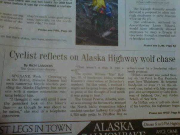 The story is riveting and horrible. The biker used his bear spray; the wolf would fade, but resume the chase. Vehicles passed and nobody stopped. There was a hill ahead and the biker was losing steam. He dismounted, used his bike as a shield, and a vehicle finally stopped.