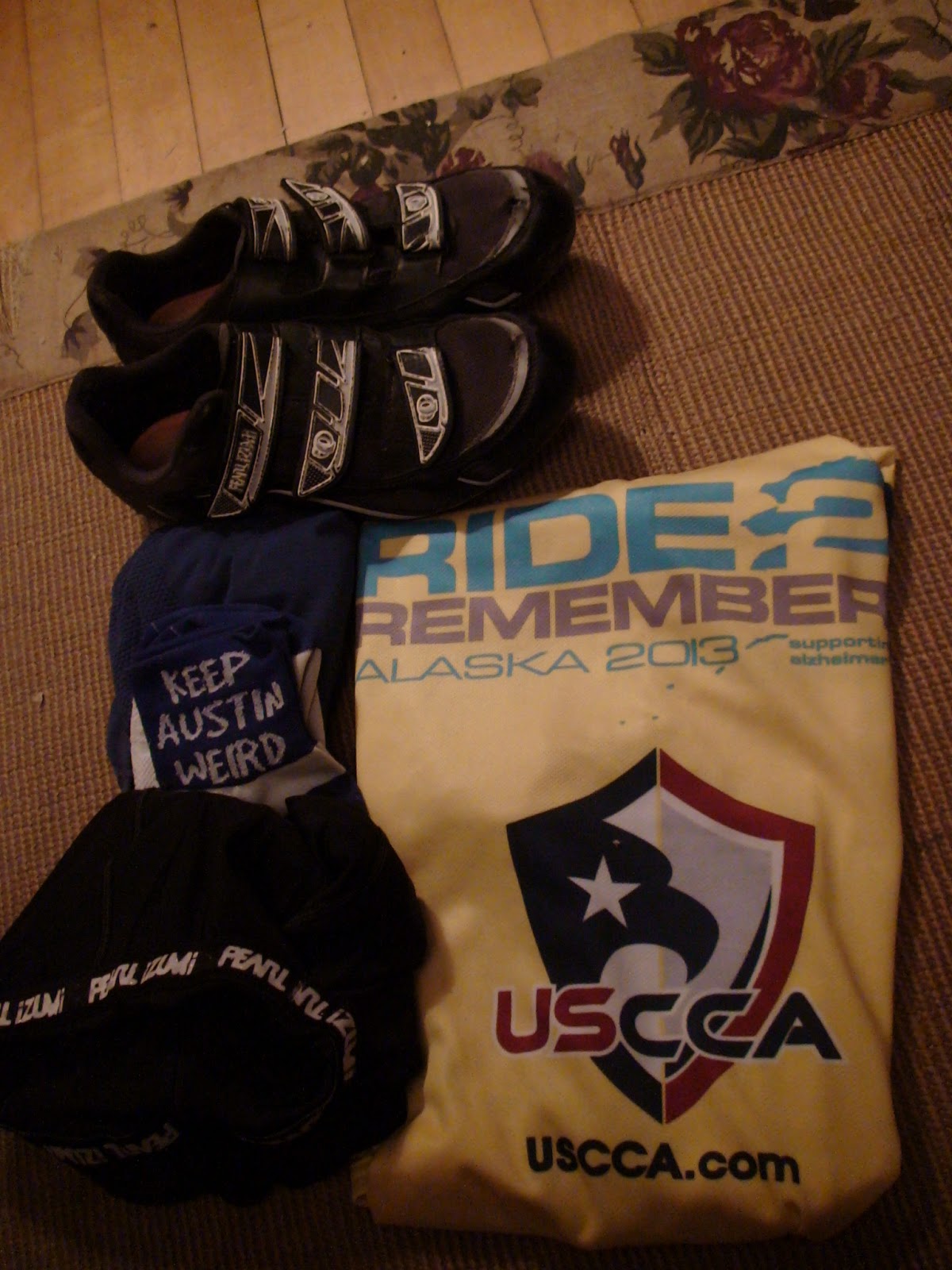 7:13 p.m.  Some Martha-Stewart insight on packing. I tightly roll my clothes instead of folding them. It’s more efficient that way. I have two panniers – read: luggage carriers for a bike. The panniers hook on to a back rack. I don’t carry much, six tour jerseys – which is a lot but I only plan on wearing three and I’ll give away the others to people who help me on tour. I have three black padded bike shorts, three socks, three sport bras, spandex pants and a heavier long-sleeved shirt, a sleeveless jacket and biking shoes. I’m also planning what to wear to the airport – so I’ll set that aside. An interesting note – I hook safety pins to every zipper on my gear. It’s an old Indian trick.