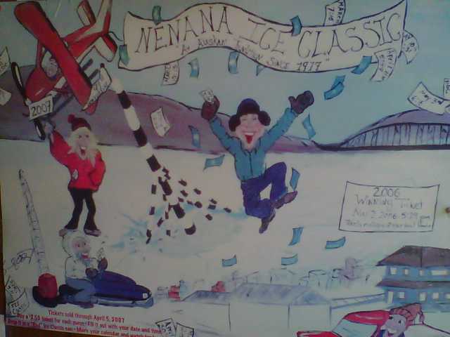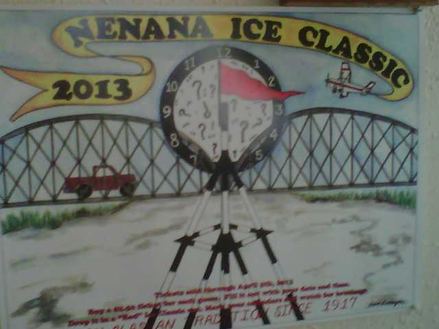 There are colorful framed posters lining the wall of Jesters, all highlighting the Ice Classic which is a wood-frame tripod planted two feet into the Tanana River ice between the highway bridge and the railroad bridge at Nenana, just upriver from the Nenana River tributary.