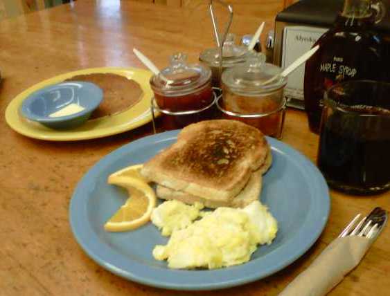 For breakfast I had a simple order of 2 scrambled eggs, toast and coffee in a glass mug. At the center of the table was a bottle of pure maple syrup from Michigan and a trio of glass jars filled with red rhubarb jam, a dark prune jam and a thick orange marmalade with wedges of rind.