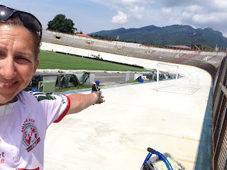 The velodrome looked to be a 250-meter track. I managed to work my way inside and onto the track. It had very high banks and I could not even reach a solid speed to stay up in the straightaways, as those have a bit of a pitch, too.