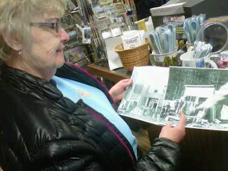 Iris Darling showing me photos from the original Brown and Hawkins Bank and Mercantile.