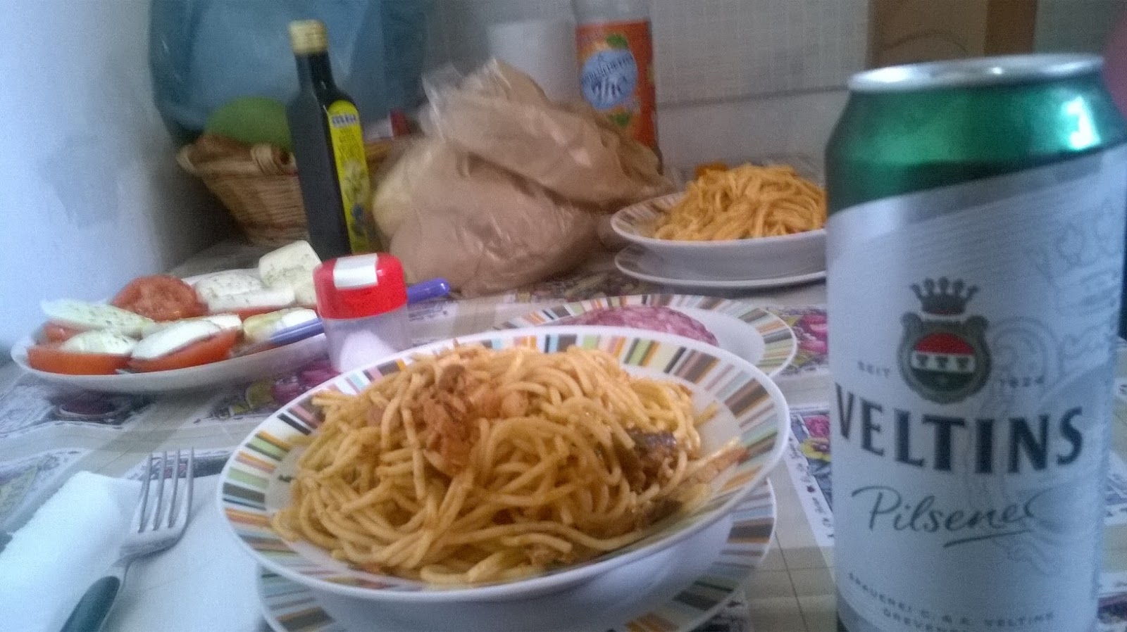 Mary whips up spaghetti with a sauce of olives and fish, and cuts some thick slices of red tomato layered with a meaty hunk of fresh mozzarella on top finished with a drizzle of olive oil and a touch of rosemary.