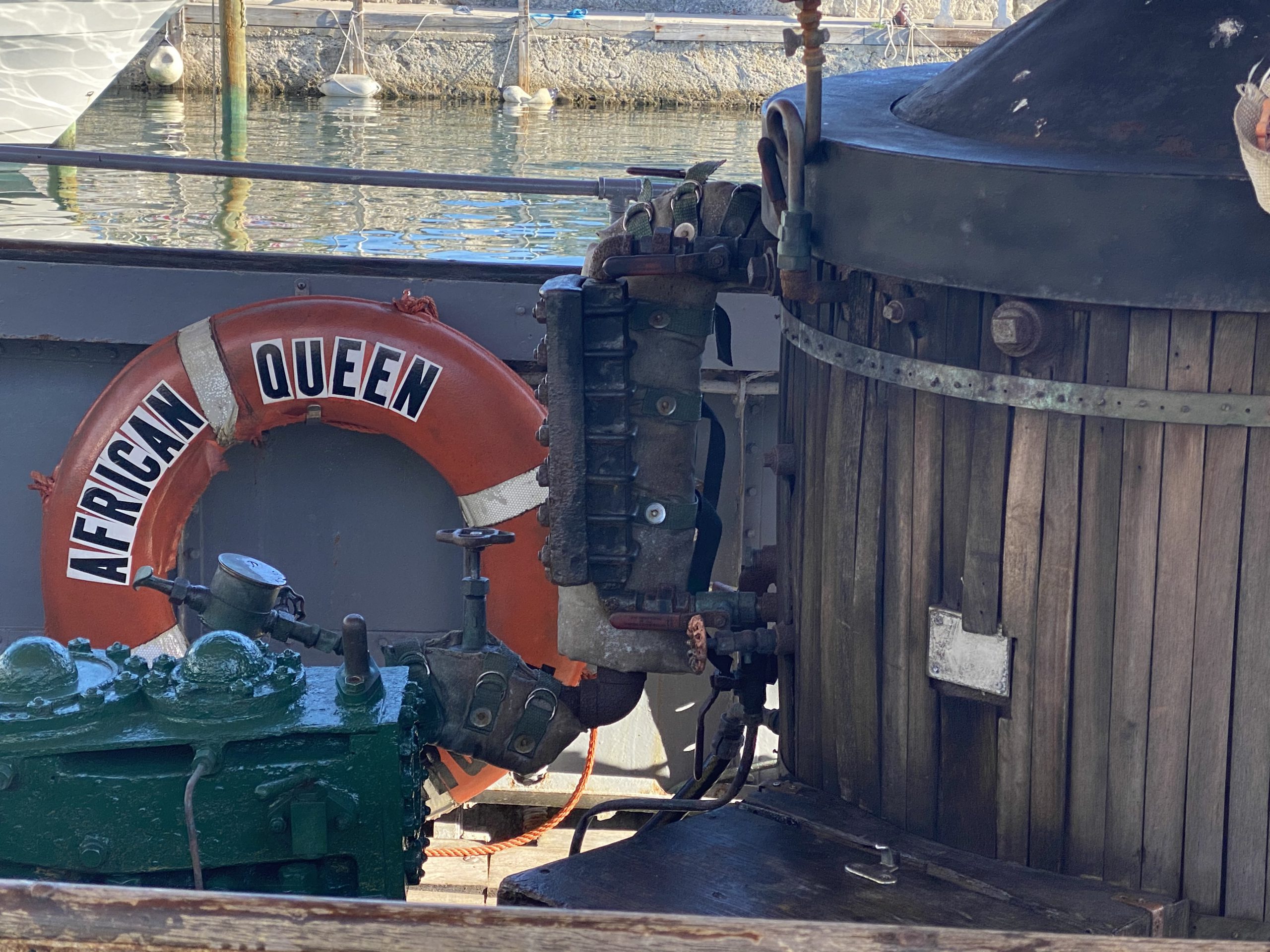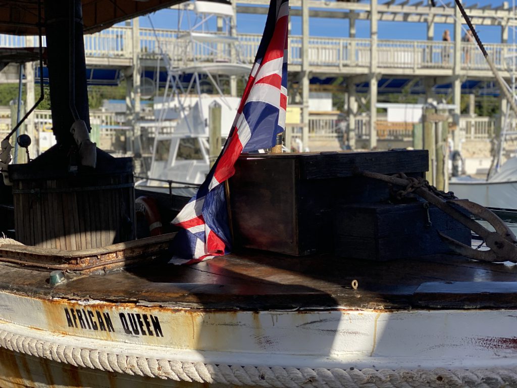 The original name for the 35-foot boat was the Livingston.  In 1949 the director of the movie, John Houston, was in Africa and as he was writing the screenplay for the movie he saw the boat working in the river. “He thought it would be a great asset for the movie so he asked the government if he could use it and they agreed and he slapped on the name African Queen.”