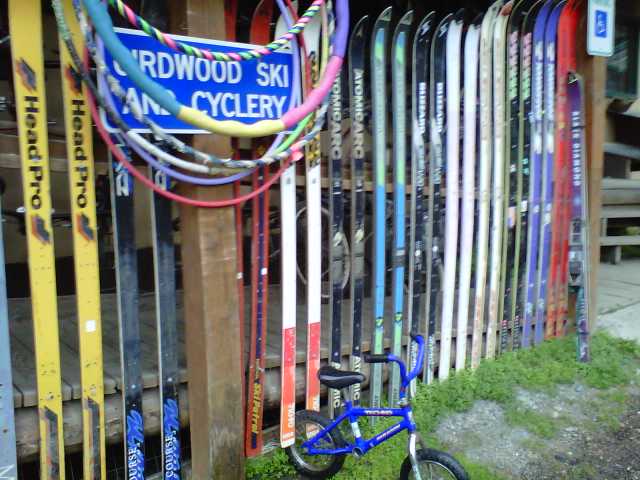 There were bikes hanging from U-hooks on every support beam available. Random skis made up the slats to the fence that ran along the edge of the raised porch.