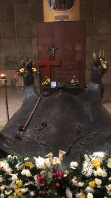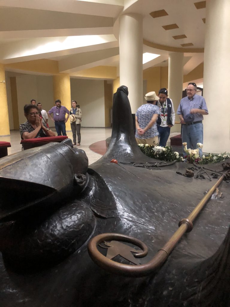 The authentic walking staff for Saint Óscar Arnulfo Romero y Galdámez sits on top of the crypt. There is a round red object in the middle of the crypt symbolizing the bullet that struck Romero in the heart. David Slinde from West Bend pointed to the senior citizens praying at the kneelers on either side of the crypt. “The person who came in with the cane is likely a follower from when Romero hosted a popular radio broadcast,” he said. “The others here are just young whippersnappers.”