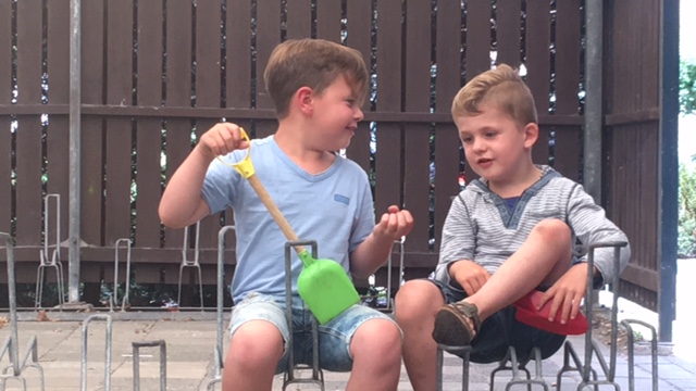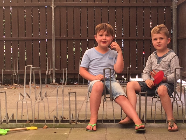 June 26, 2017 – Netherlands – Simon and Sam found me. The pair were up to no good summertime shenanigans. Digging a tunnel to China next to a covered bike port where I was taking a rest.